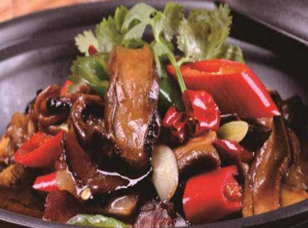 8、加入牛肝菌中小火烧个20分钟左右。最后大火收干汁,加入干红椒炒匀即可。