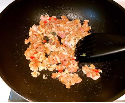 6、加入鸡肉块中火翻炒3-5分钟。