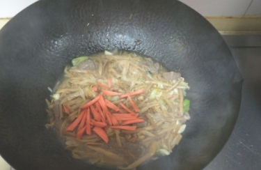 翻炒食材,让蚝油和食材混合均匀,然后放入少量凉开水,再放入胡萝卜;