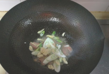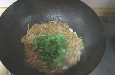 翻炒一会,临出锅时放入香菜段,炒匀即可。