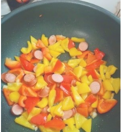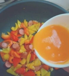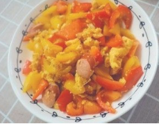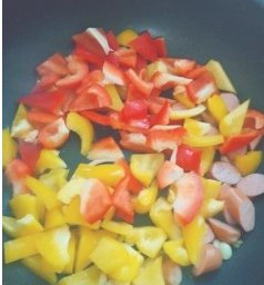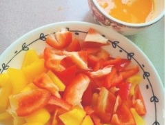 红椒、黄椒切滚刀;鸡蛋碗里打散加盐。香肠切片;