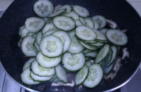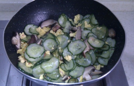 炒至黄瓜变透明色了,再加入鸡蛋和盐,一起煸炒一会儿即可。
