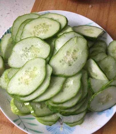 黄瓜切片备用,这是自家种的黄瓜,没有削皮。