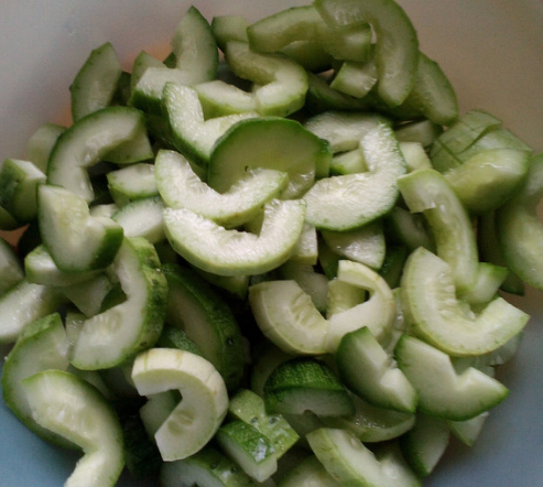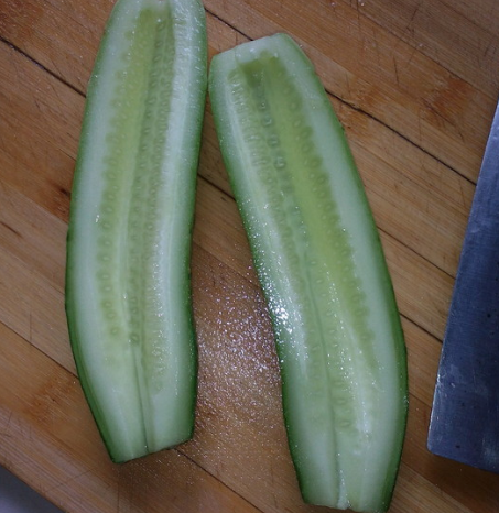 黄瓜洗净切成两半,切掉中间的瓤;