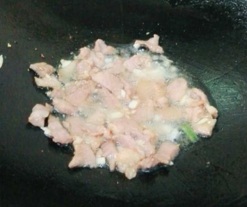 锅烧七成热放适量花生油,大蒜放下去煸出香味,再将猪肉倒下去,大火炒至肉变白色即可;