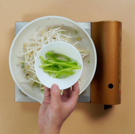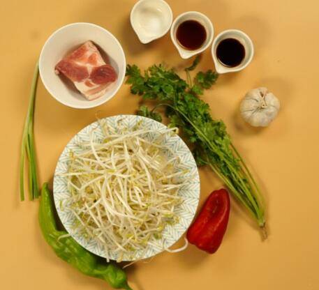 主料:猪五花100克、绿豆芽300克。辅料:大蒜5克、香葱1根、香菜10克、青红椒各20克、食用油5毫升、醋3克、生抽3克、食用盐2克。