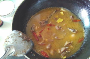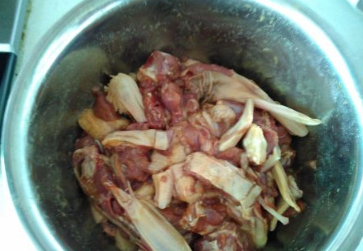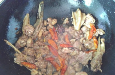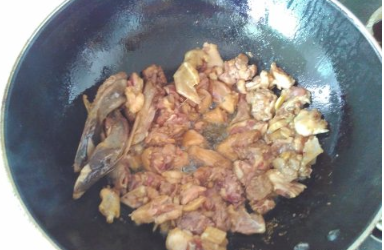 锅中再加入适量油,先将鸭头等大块肉放入先炒,再放入小块肉共炒,将鸭肉炒至五成熟。