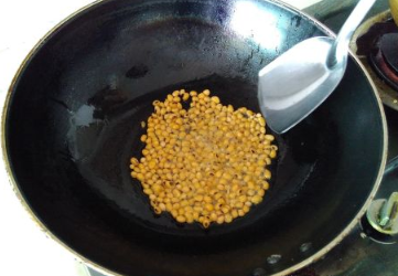 锅中放入油,稍多一些,放入黄豆,炒至熟。