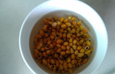 用少许盐,加入3/4碗水,调成盐水,将炒熟的黄豆放入盐水中。