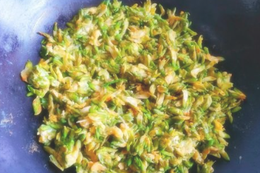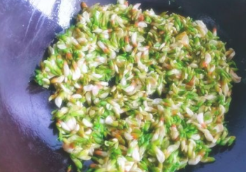 槐花翻炒几下,加入食盐调味;