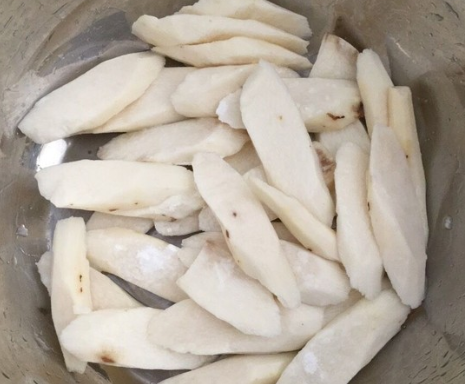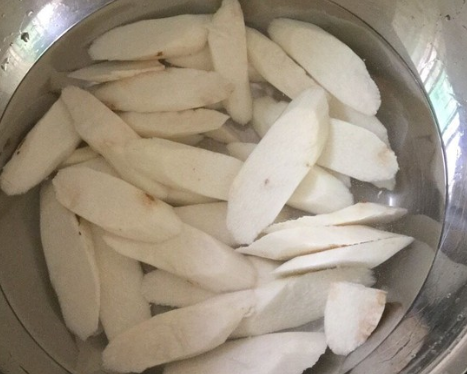 淮山斜切片,用清水浸泡15分钟,中间换水一次;