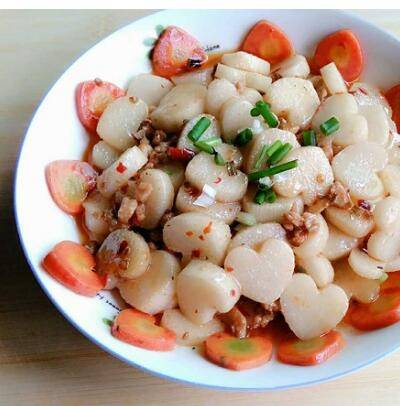 主料:淮山3根、猪肉(瘦)40克。辅料:玉米油1勺、葱5克、姜5克、蒜5克、盐2勺、鸡精半勺、郫县豆瓣1勺、胡萝卜200克。