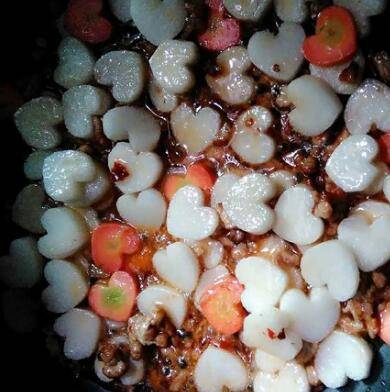 切厚点的片,用模具切心状(没有模具可以不用),切完泡水里,胡萝卜也一样。
