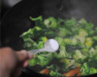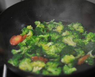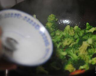 将西兰花倒进去,稍微翻炒,将淀粉水沿着锅边淋入。