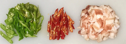 加入青红辣椒,继续煸炒至五花肉焦黄;
