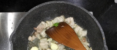 锅内留一些油,将五花肉倒进锅内煸炒;