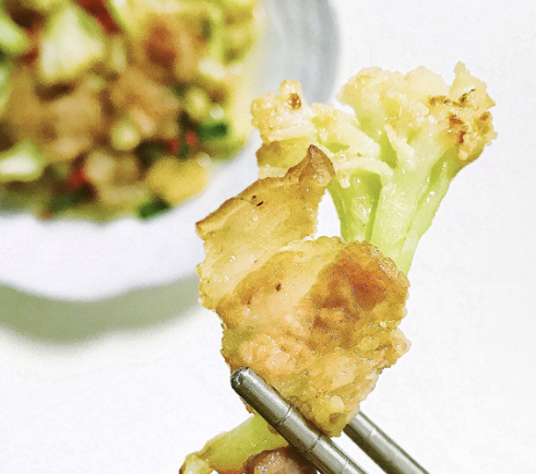 看到花菜头有点微微焦黄,捞起来备用,多余的油倒出;