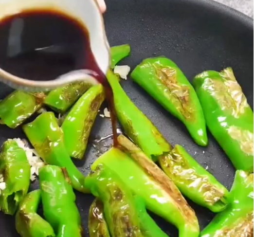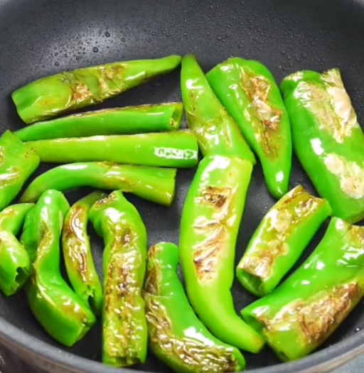 锅中放少许油,放入青椒,煎至两面虎皮状;