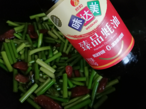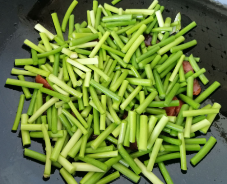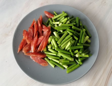 准备食材:腊肠3根、蒜苔200克、油适量、盐1勺、生抽1勺、蚝油1勺、葱适量。