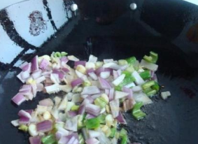 1、胡芹切片,洋葱切片,大蒜切段,西红柿切成丁(泥);