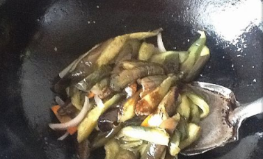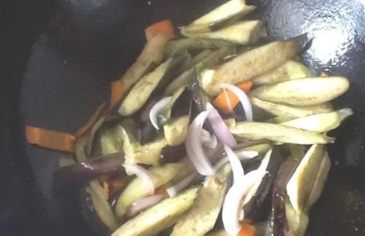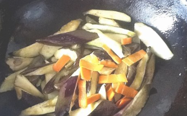 锅里放入适量的植物油,等油5成热时,倒入准备的胡萝卜炒片刻,加入切好的茄子条,一起炒2分钟左右。