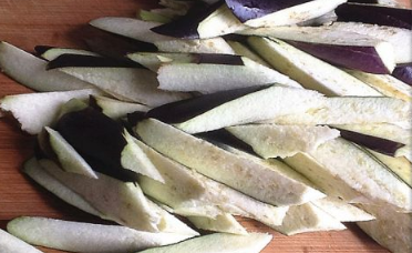 茄子洗净,切成长条备用。