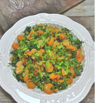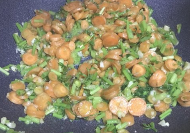 加入切碎的胡萝卜根茎部分,撒少许盐快速翻炒几下;