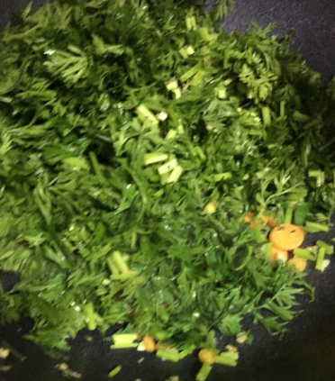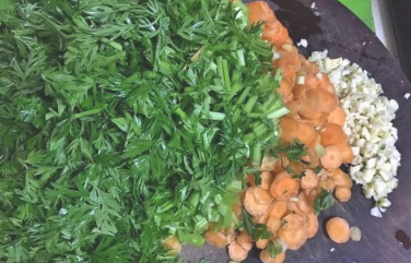 胡萝卜苗洗净切碎,大蒜切成末备用;