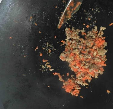 热锅下油,把腌好的肉末和胡萝卜碎炒至变色乘起。