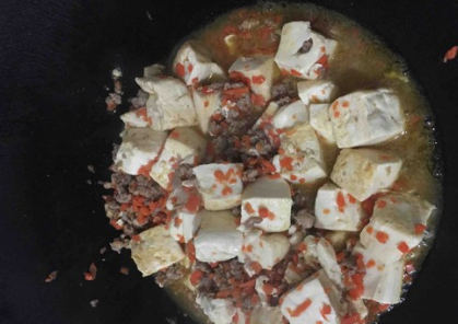 将炒好的肉末胡萝卜放入豆腐中拌匀再烧片刻,加适量盐油翻炒即可上盘。