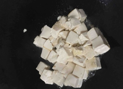 热锅下油,将豆腐块下锅稍微煎至微黄,放少许水盖上锅盖焖片刻。