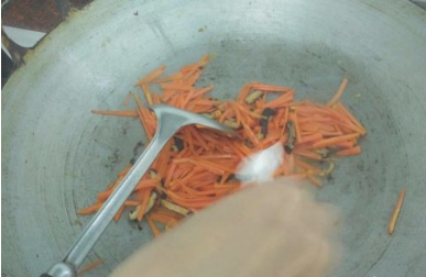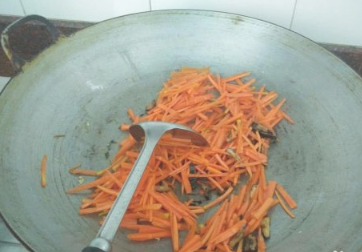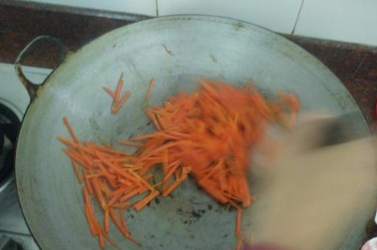 锅里再添些油,油烧热后,倒入胡萝卜丝,开始快速翻炒,过程中油温太高时可加入少量水。