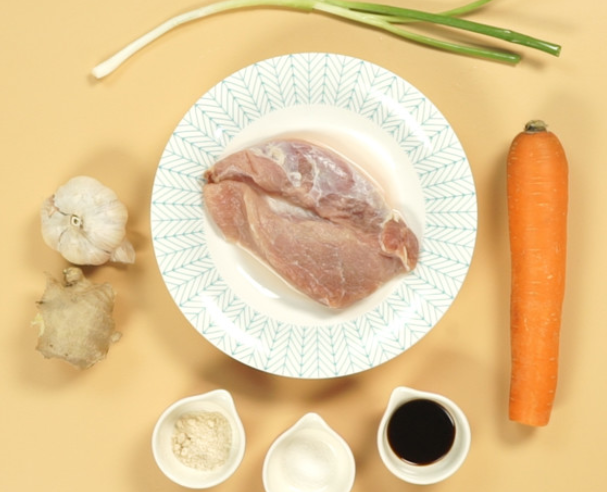 准备胡萝卜1根去皮切片,葱花5g、姜末5g、蒜片8g、猪肉30g切片;