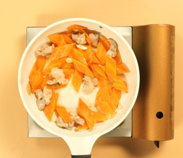 起锅倒入油5ml,倒入葱姜蒜,倒入肉片,煸炒至变色倒入胡萝卜,翻炒均匀后放入胡椒粉2g、生抽3g、盐2g,翻炒均匀,出锅。