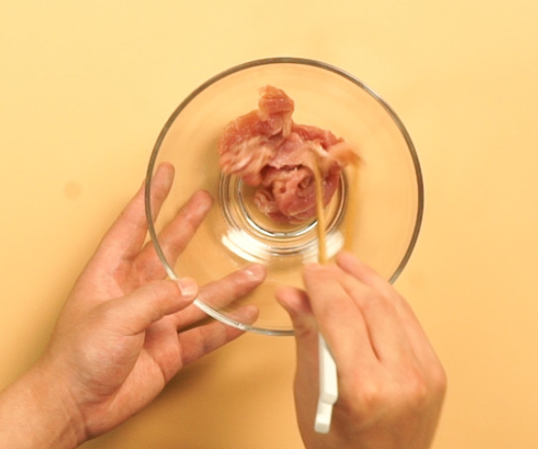 碗中放入猪肉,盐1g搅拌均匀;