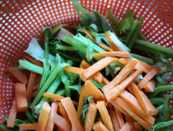 将芹菜、胡萝卜洗净,芹菜切段,胡萝卜先切成片再切成小条;