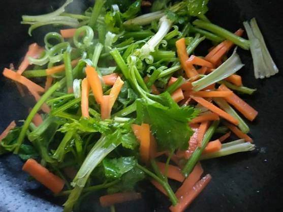 油热之后,将芹菜和胡萝卜一起加入到油锅中;