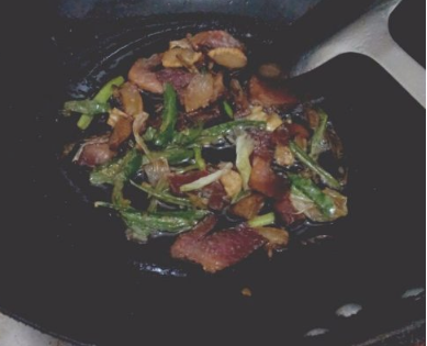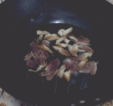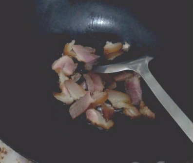 锅内水烧干,倒入腊肉炒出油。