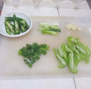 切一根葱,葱白和葱花分开,切一根青椒,两个小辣椒,两瓣蒜。