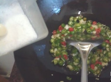 加入青红椒一起煸炒。