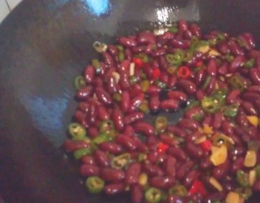 然后就可以把红腰豆倒入锅内翻炒了。
