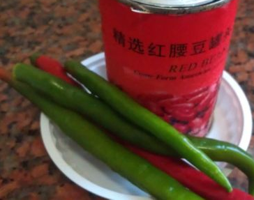 准备青红椒与罐装红腰豆。