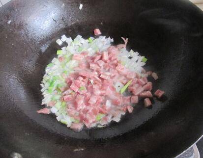 改成小火,把切成小丁的培根放入煸炒出油。