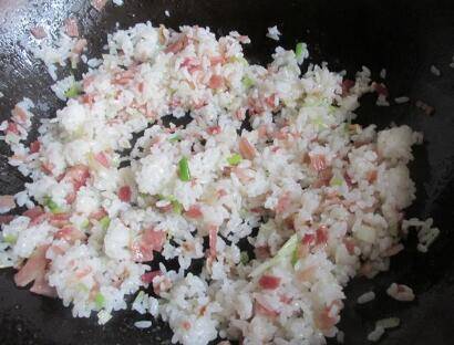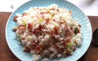 主料:米饭1碗、培根2片。辅料:葱少许、盐少许、花生油少许。