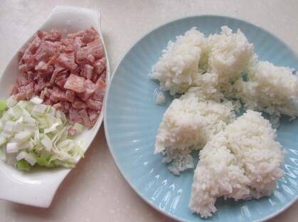先准备材料,剩米饭,培根切成小丁,葱切末。