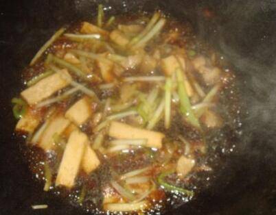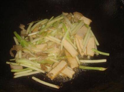 把韭芽、豆腐干、肉倒进油锅里翻炒下。