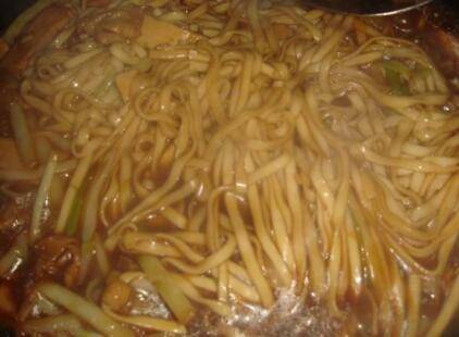 把取出的面条加到韭芽的锅里。