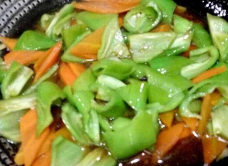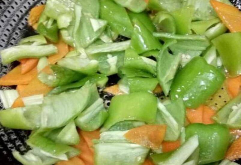 3、锅中放油炒葱花,炒胡萝卜片,再放尖椒煸炒。