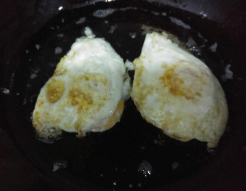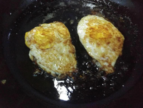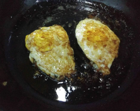 锅中放油烧热,打入鸡蛋。两面煎制微黄;