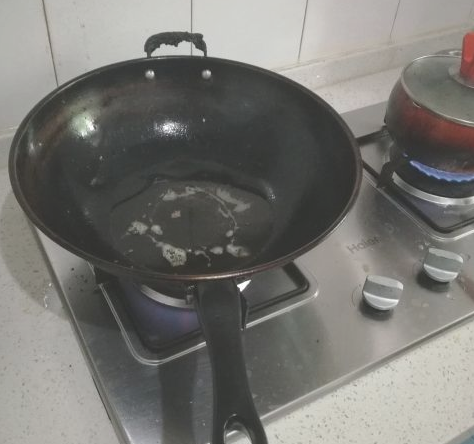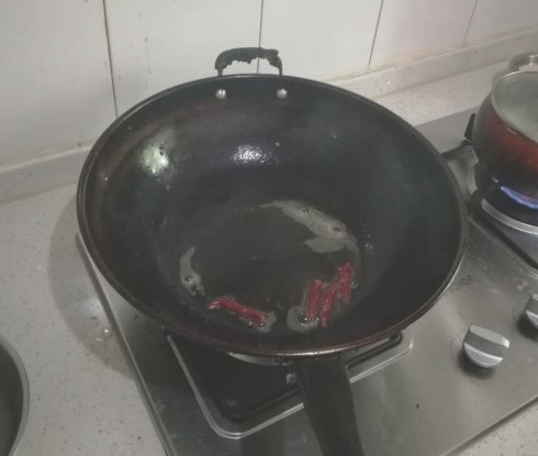 炒锅洗干净,烧干锅里的水汽,然后倒入适量的清油。